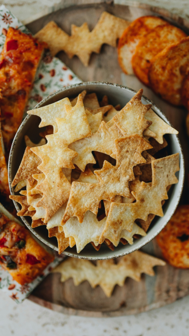To make the torilla bats, you need 8 full size tortillas for each batch, a bat-shaped cookie cutter, 1 tablespoon of coconut oil (if you don't want to use real butter), and 1 tablespoon of olive oil.
